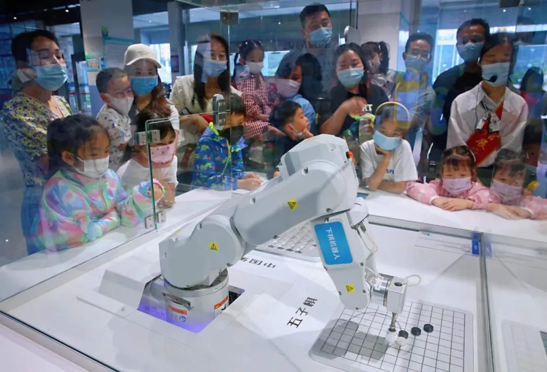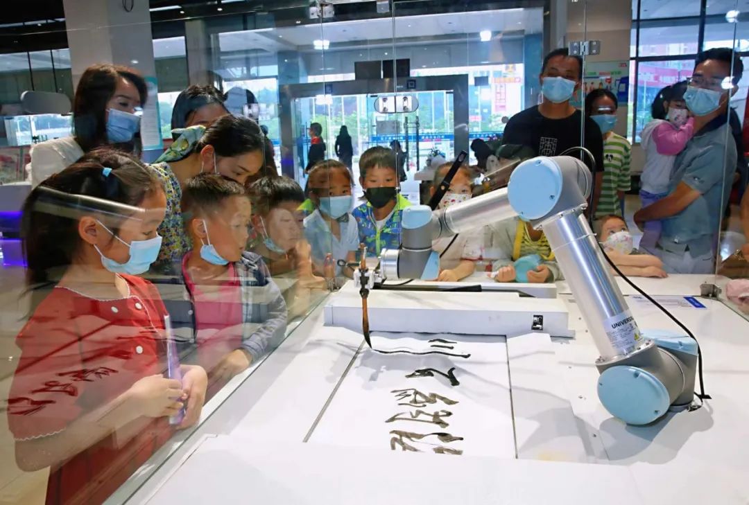機器人書法家寫的“海納百川”四個字筆力蒼勁,引得幾個孩子不由自主地伸出大拇指。在機器人樂園,孩子們發(fā)現(xiàn)里面除了迎賓機器人、機器人鋼琴家、機器人書法家外,還有舞劍與轉(zhuǎn)陀螺機器人、畫像機器人、下棋機器人、解魔方的機器人、高速分球機器人、VR駕駛室等等,真是琴棋書畫,樣樣皆通!
