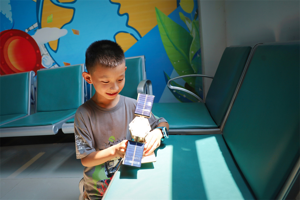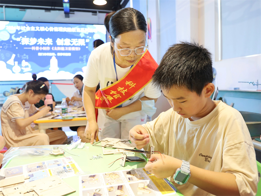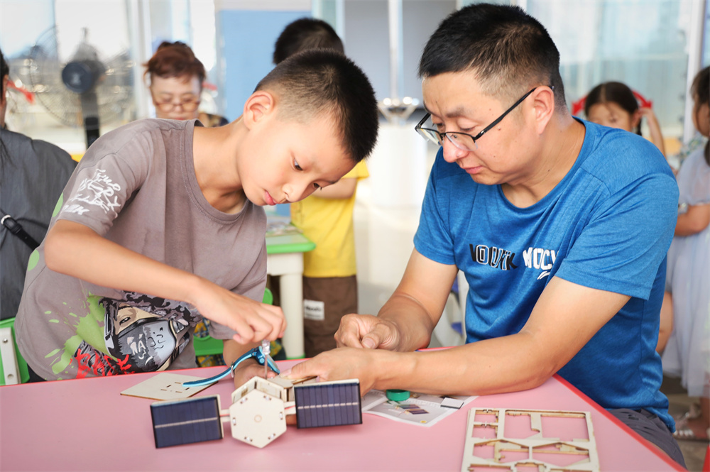 隨后,小朋友們在志愿者的指導(dǎo)下,利用太陽能板和模型材料,開始制作屬于自己的人造衛(wèi)星模型。小朋友們充分發(fā)揮想象力和創(chuàng)造力,認真地拼接、調(diào)試,每個步驟都一絲不茍。志愿者們則在一旁耐心地答疑解惑,給予孩子們悉心的指導(dǎo)和鼓勵。