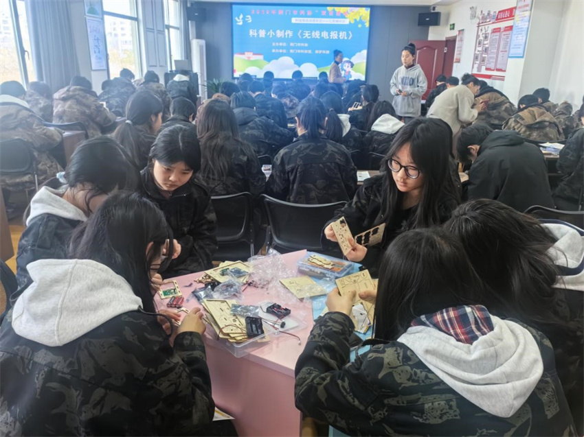 公益課堂上,專業(yè)老師指導(dǎo)學(xué)生制作無線發(fā)報機模型。該發(fā)報機利用摩爾斯電碼實現(xiàn)簡易的無線通信,通過按鍵輸入信號,電報機會將信號轉(zhuǎn)換為無線電波進行傳輸,在接收端還原信號,并驅(qū)動LED燈和蜂鳴器指示信號。整個制作過程充滿了挑戰(zhàn)與驚喜,經(jīng)過一個半小時的努力,學(xué)生們制作成功,紛紛和無線發(fā)報機模型合影。最后,志愿者發(fā)放了各類科普資料,大篷車播放了防震救災(zāi)視頻,讓大家從不同角度汲取科學(xué)養(yǎng)分。